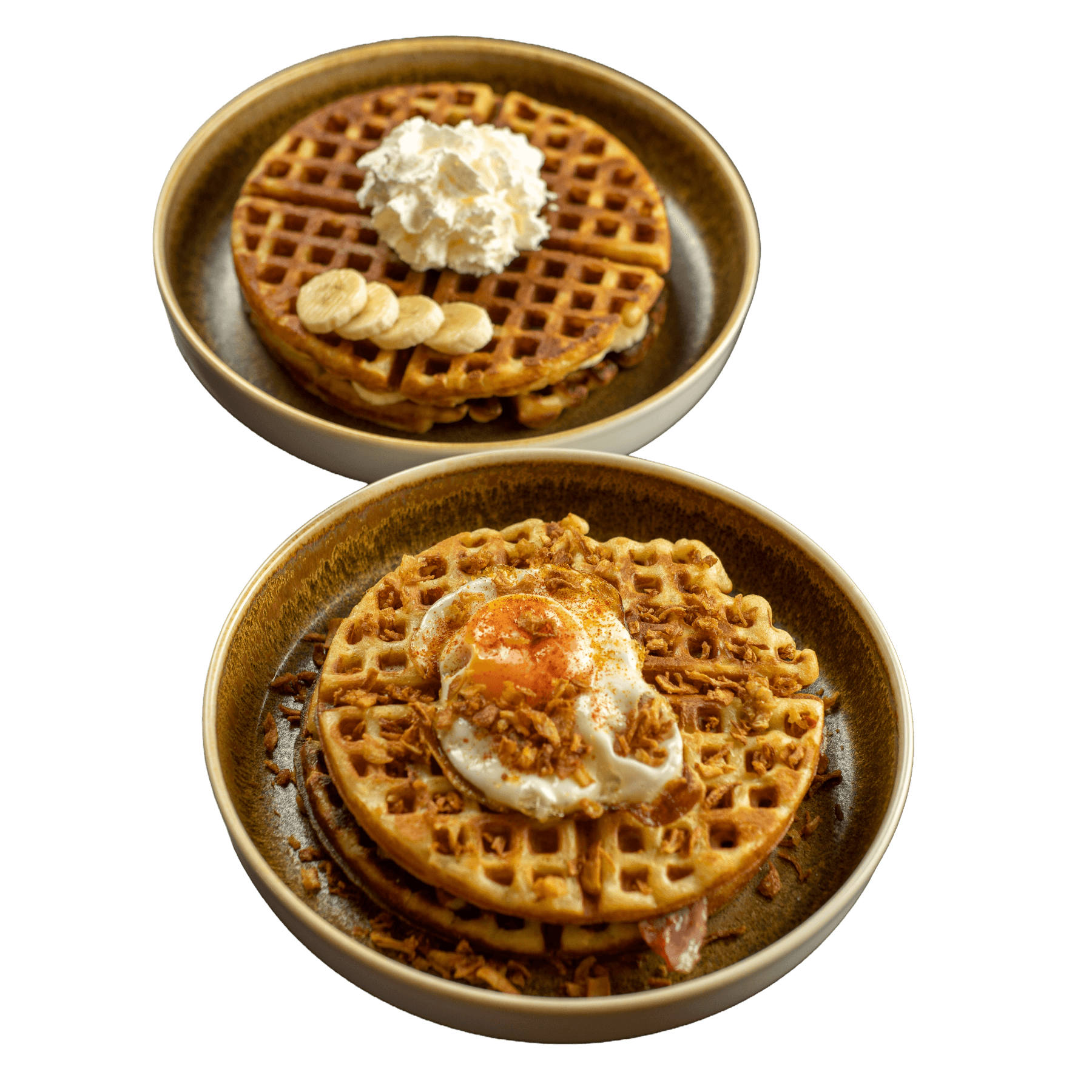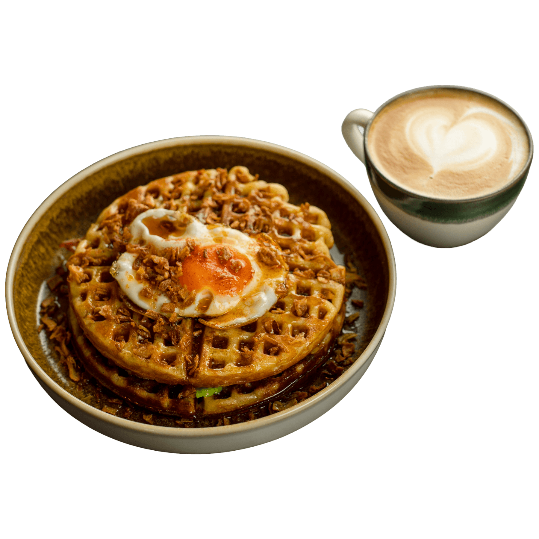 Waffel mit Avocado, Spiegelei, Speck, Röstzwiebeln und Ahornsirup